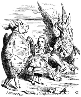 La Tortuga Falsa suspira profonda, e tira la dorso de un aleta ante sua oios. El regarda Alisia e atenta parla, ma sanglotas sofoca sua vose tra un minuto o du. “Lo es como si el ta ave un oso en sua garga,” la Grifon dise; e lo comensa la taxe de secute el e colpa sua dorso con un punio. Final, la Tortuga Falsa regania sua vose e, con larmas fluente sur sua jenas, el continua denova: