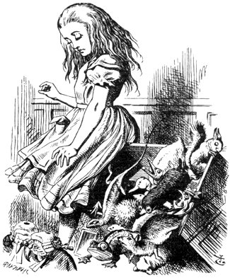 Prima, el imajina la peti Alisia mesma: denova, la manos pico es abrasada sur sua vasto, e la oios briliante regarda zelosa la suas—el pote oia la tonos mesma de sua vose, e vide acel peti secute strana de sua testa per controla la capeles vagante cual vole sempre cade ante sua oios—e en cuando el escuta, o pare escuta, tota la loca ambiente deveni poplida par la animales strana de la sonia de sua sore peti.