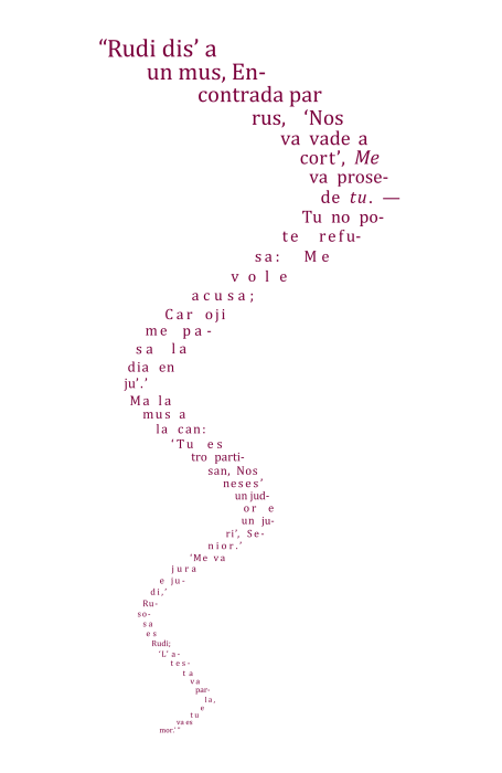 “Lo es serta longa,” Alisia dise en mervelia, regardante la coda de la Mus; “ma perce tu dise ce lo es triste?” E el continua pensa tan forte sur la coda en cuando la Mus parla, ce el imajina ce la raconta ave un forma simil a la seguente: