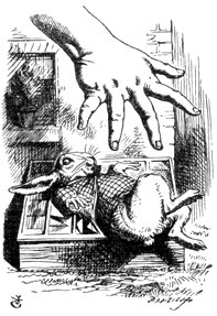 “Mary Ann! Mary Ann!” said the voice. “Fetch me my gloves this moment!” Then came a little pattering of feet on the stairs. Alice knew it was the Rabbit coming to look for her, and she trembled till she shook the house, quite forgetting that she was now about a thousand times as large as the Rabbit, and had no reason to be afraid of it.