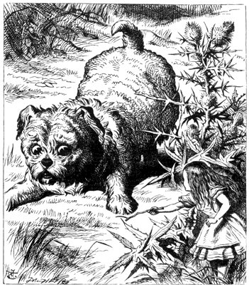 Hardly knowing what she did, she picked up a little bit of stick, and held it out to the puppy: whereupon the puppy jumped into the air off all its feet at once, with a yelp of delight, and rushed at the stick, and made believe to worry it: then Alice dodged behind a great thistle, to keep herself from being run over; and, the moment she appeared on the other side, the puppy made another rush at the stick, and tumbled head over heels in its hurry to get hold of it: then Alice, thinking it was very like having a game of play with a cart-horse, and expecting every moment to be trampled under its feet, ran round the thistle again: then the puppy began a series of short charges at the stick, running a very little way forwards each time and a long way back, and barking hoarsely all the while, till at last it sat down a good way off, panting, with its tongue hanging out of its mouth, and its great eyes half shut.