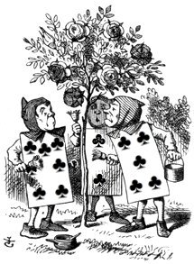 A large rose-tree stood near the entrance of the garden: the roses growing on it were white, but there were three gardeners at it, busily painting them red. Alice thought this a very curious thing, and she went nearer to watch them, and, just as she came up to them, she heard one of them say “Look out now, Five! Don’t go splashing paint over me like that!”