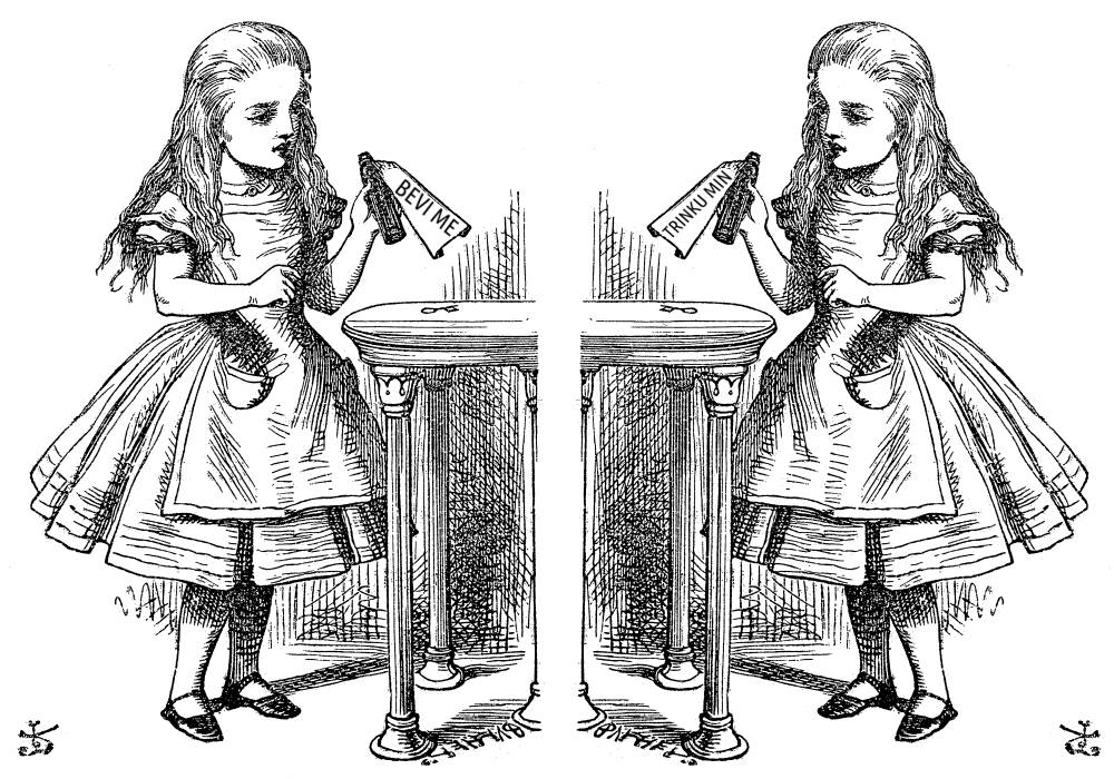 Mea posta presedente ia fa un presenta corta de elefen, ance nomida lingua franca nova, un creol romanica regulada, e ia indica alga de la modos en cual lo sembla e difere de esperanto. A esta ves, me va regarda como bon esta du linguas susede en tradui la bromas de parolas en la obra mestral de asurdia multe engles par Lewis Carroll, Alice’s Adventures in Wonderland.