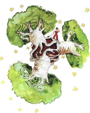 Je fis remarquer au petit prince que les baobabs ne sont pas des arbustes, mais des arbres grands comme des églises et que, si même il emportait avec lui tout un troupeau d’éléphants, ce troupeau ne viendrait pas à bout d’un seul baobab.