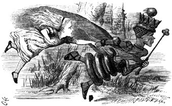 Alice never could quite make out, in thinking it over afterwards, how it was that they began: all she remembers is, that they were running hand in hand, and the Queen went so fast that it was all she could do to keep up with her: and still the Queen kept crying “Faster! Faster!” but Alice felt she could not go faster, though she had not breath left to say so.