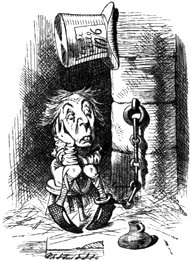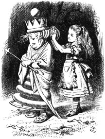 “O, avenis en la semana pos la veninte,” la Rea responde en un tono casual. “Per esemplo,” el continua, ponente un peso grande de bandaje sur sua dito en cuando el parla, “considera la Mesajor de la Re. El es aora en prison, per es punida: e la prosede no va comensa an asta la mercurdi veninte: e natural, la crimin va aveni final de tota.”