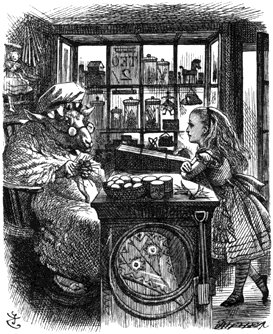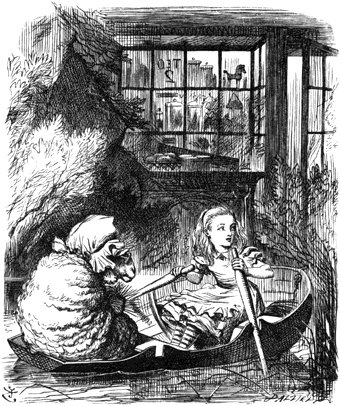 El regarda la Rea, ci pare subita envolveda en lana. Alisia frota sua oios, e regarda denova. El tota no pote comprende cua ia aveni. Esce el es en un boteca? E vera, esce acel es—esce lo es vera un ovea ci senta a la otra lado de la table de vende? An con tota sua frotas, el no pote comprende plu la situa: el es en un peti boteca oscur, apoiante sua codos sur la table de vende, e a fas de el un Ovea vea senta tricotante sur un seja de brasos, e sesante de ves a ves per regarda el tra un oculo grande.