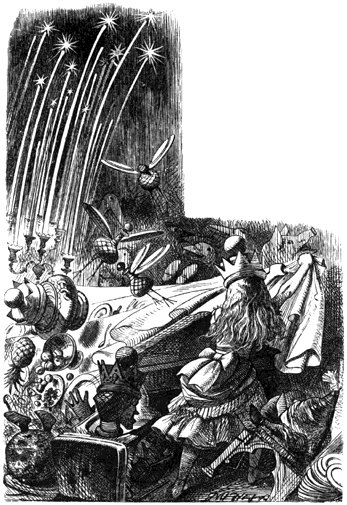 E alora (como Alisia descrive lo a pos) cosas de tota spesies aveni en un momento. Tota la candelas crese asta la sofito, con aspeta alga simil a un fondo de juncos con focos artal a la culmina. E per la botelas, cada de los prende un duple de platos, cual los fisa rapida sur se como alas, e tal, con forces como gamas, los voleta de asi a ala en tota dirijes: “e los aspeta multe simil a avias,” Alisia pensa a se, tan bon como posible en la confusa estrema cual comensa.